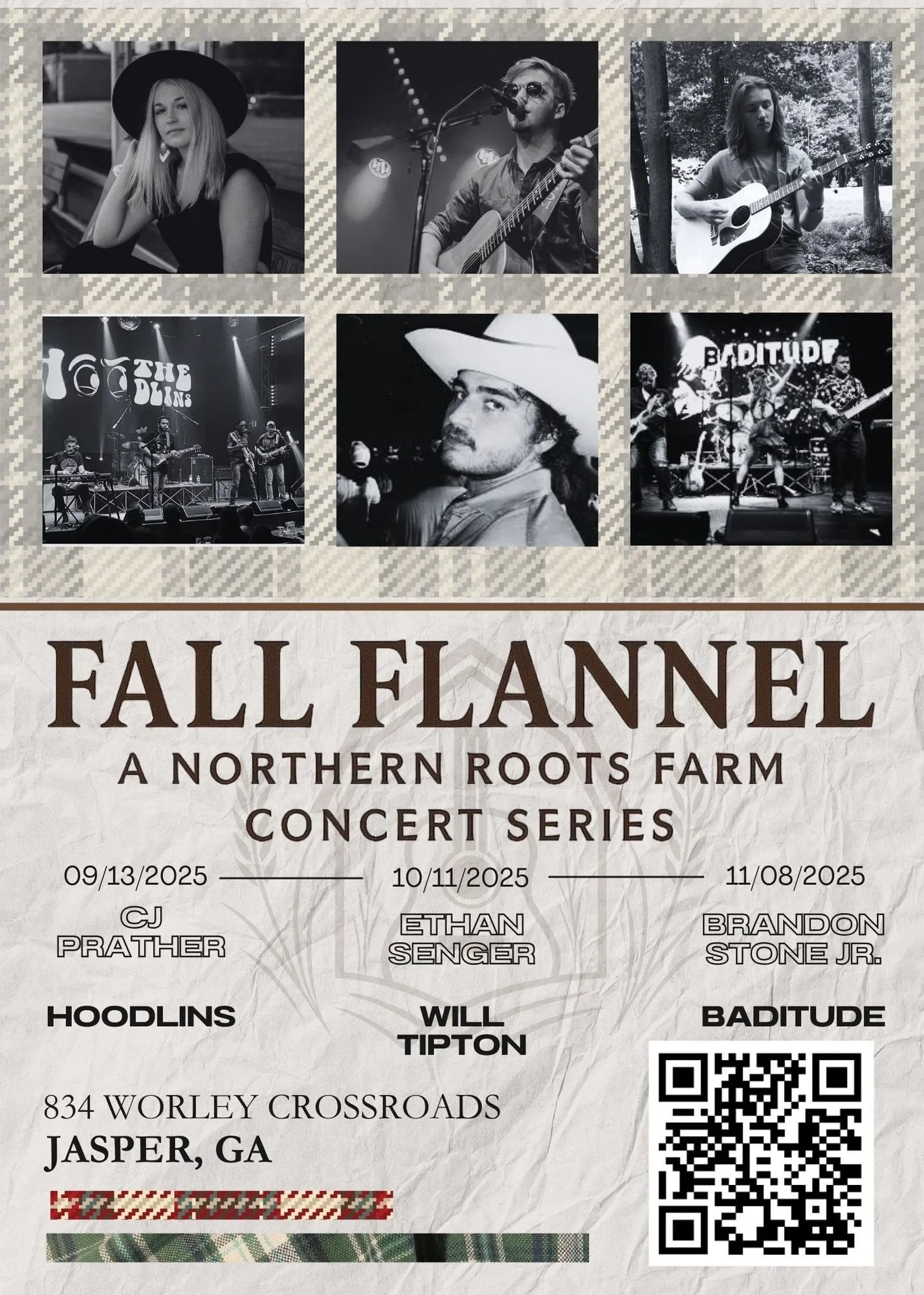 At Northern Roots Farm, we’re proud to announce the Fall Flannel Concert Series powered by Expedition Events—a brand-new community-centered concert experience set in the heart of Pickens County. Designed to celebrate cooler weather, live music, and local charm, this series will take place on the second Saturday of each month from September through November, from 6 PM to 10 PM. Our goal is to create a welcoming, rustic yet upscale, and relaxed environment that brings the community together while supporting local talent and businesses.