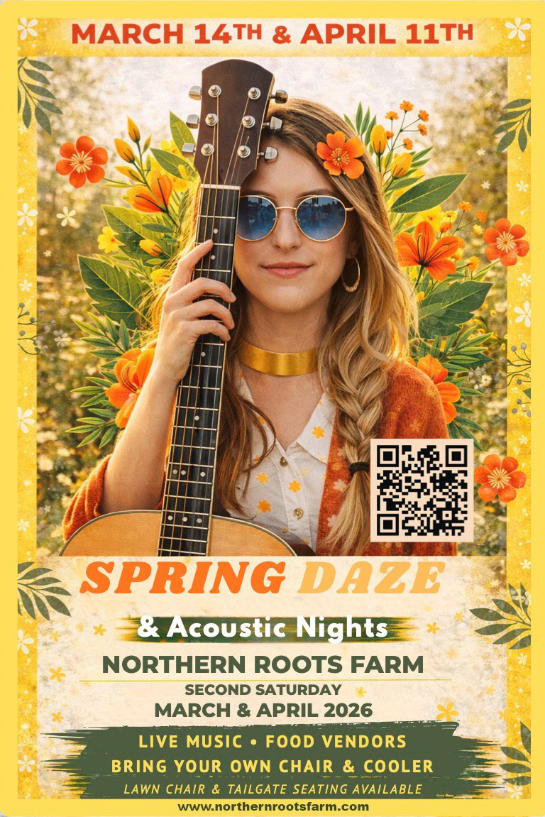 Spring Daze & Acoustic Nights at Northern Roots Farm is a 2-night acoustic concert series unfolding across the season, with live music nights on March 14th and April 11th. Set against the backdrop of Northern Roots Farm, these nights are all about relaxed vibes, incredible acoustic performances, and a welcoming community that comes together to enjoy great music, fresh air, and meaningful moments under the open sky.